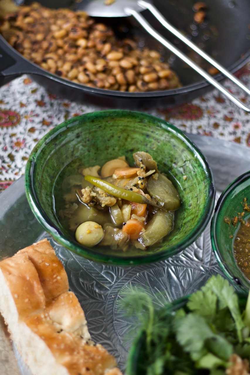 Yatimak – Auberginen mit Schwarzaugenbohnen in Tamarinden-Sauce یتیمک ist eine typische Speise aus Buschehr im Südwesten Persiens am Persischen Golf. Es handelt sich um ein veganes und glutenfreies Gericht, das nur wenige Zutaten benötigt . Yatimak besteht aus knackigen Schwarzaugenbohnen, Auberginen und Zwiebel, die in einer sämigen Sauce aus Tamarinden, Kurkuma und Advieh schmoren. Im Süden Persiens wird es gerne mit extra viel Chili gewürzt und schön scharf gegessen. Ich habe dieses mal auf die Schärfe verzichtet und muss sagen, schmeckt mir sogar viel besser. Auf jeden Fall solltest du es mit Sir Torshi – eingelegter Knoblauch, Makhlut * – sauer eingelegtes Gemüse, Sabzi Khordan- Kräuterplatte und Nan-e Barbari – persisches Fladenbrot essen, so wird es klassischerweise in Buschehr serviert.