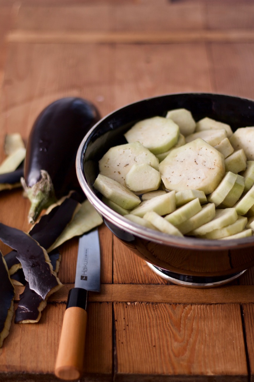 Auberginen schälen und in Scheiben schneiden. Mit einem Esslöffel Salz in eine Schale kaltes Wasser geben und für mindestens 15 Minuten ziehen lassen. Dieses Verfahren entzieht der Aubergine Bitterstoffe und beim Anbraten benötigst du weniger Fett.