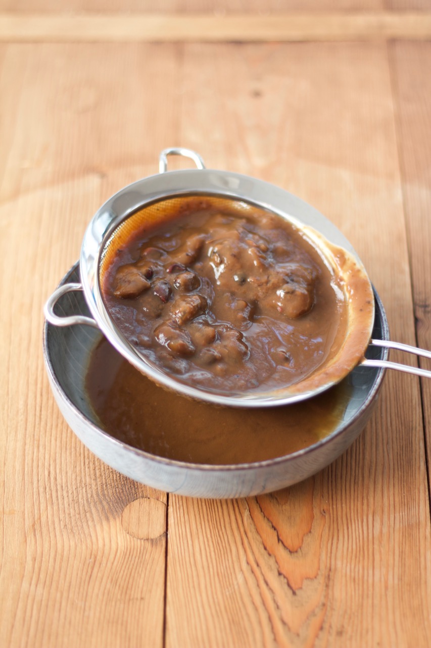 In ein Sieb geben, mit einem Löffel rühren und das Tamarindenwasser in einer Schüssel auffangen. Immer wieder mit dem Löffel unten am Sieb die Sauce abtragen.