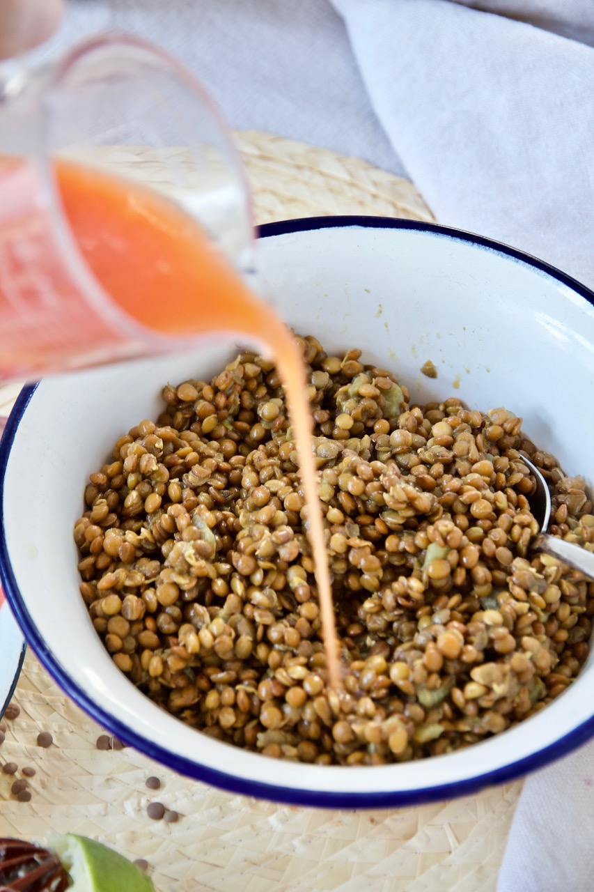 Orangen- und Limetten auspressen und den Saft, die abgetropften Linsen und die Gewürzmischung in eine Schüssel geben, mit einem Pürierstab* cremig pürieren.