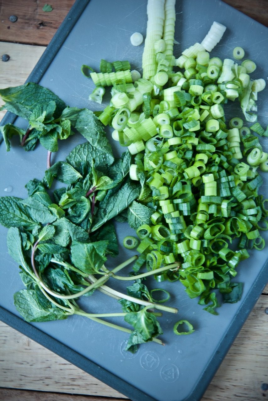Frühlingszwiebeln in feine Ringe schneiden und mit fein gehackten Kräutern, Salz und Pfeffer zu den Schälerbsen geben und weitere 30 Minuten köcheln.