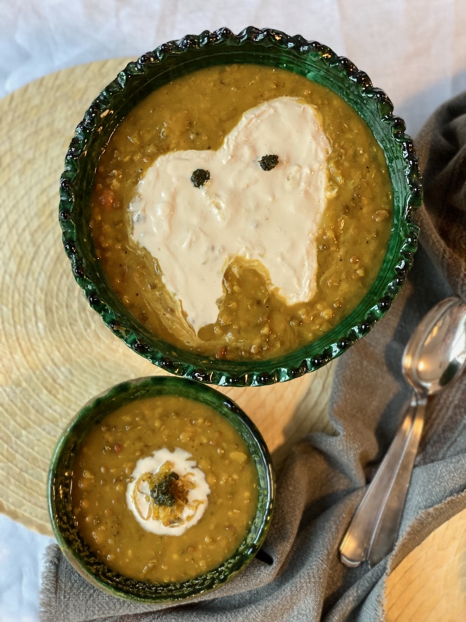 Mit zwei Klekse Piaz Dagh die Augen darauf verzieren. Den restlichen Piyaz Dagh zum Eintopf in eine Extra Schüssel servieren.