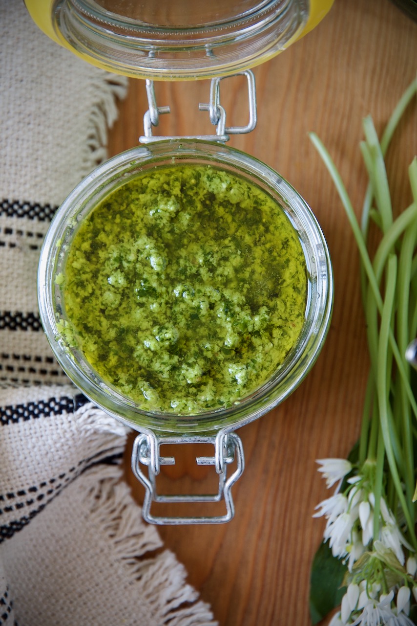Endlich ist der Frühling da und von März bis Mai ist Bärlauchsaison. Eigentlich viel zu kurz, deshalb konserviere ich mir den Bärlauch als köstliches Bärlauch-Pesto mit Cashew und Feta. So kann ich im Nu Pasta, Risotto, Gnocchi, gebackene Kartoffeln, gegrilltes Fleisch oder einfach ein Sandwich Ruck Zuck aufpeppen. Du brauchst nur ein paar Zutaten um dieses leckere Pesto in ein Paar Minuten zu zaubern. Zutaten wie Bärlauch, geröstete Cashewkerne, würziger Feta, etwas Zitronensaft und bestes Olivenöl verbinden sich in diesem Pesto zu einem harmonischen Aroma.