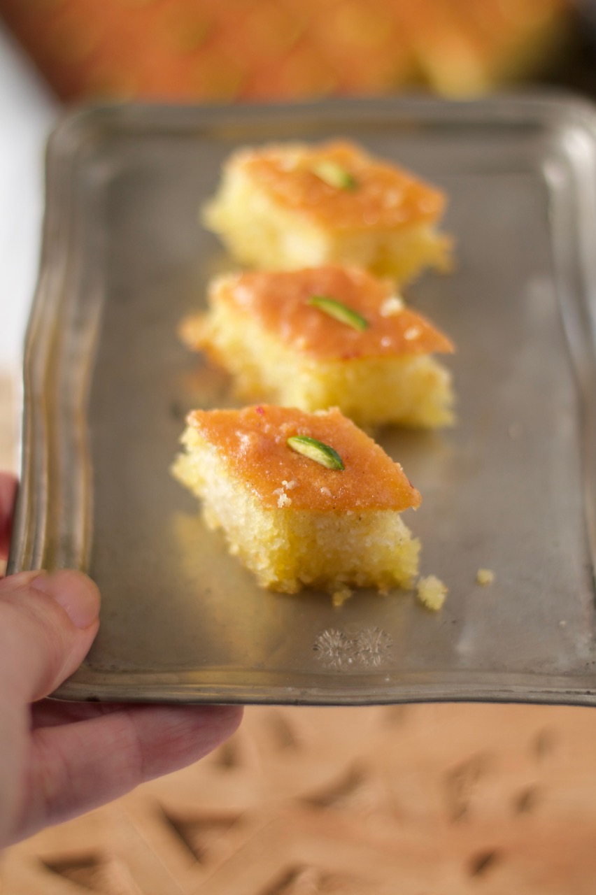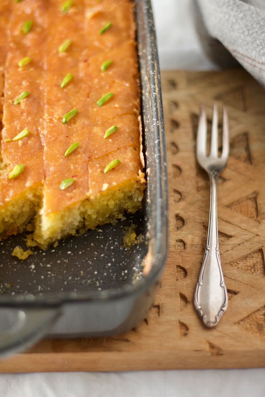 Erst wenn der Kuchen erkaltet ist, den Safran-Sirup zubereiten. Zucker mit Wasser und Safranwasser bei mittlere Hitze für 15 Minuten köcheln lassen. Von der Herdplatte nehmen, Rosenwasser, Honig zufügen und gut verrühren bis der Honig aufgelöst ist. Kuchen erkalten lassen, dann in Rauten oder Würfel schneiden und mit dem noch warmen Safran-Sirup begiessen und 4 Stunden stehen lassen. Jede einzelne Raute mit Pistazienstifte oder gemahlene Pistazien dekoriern.