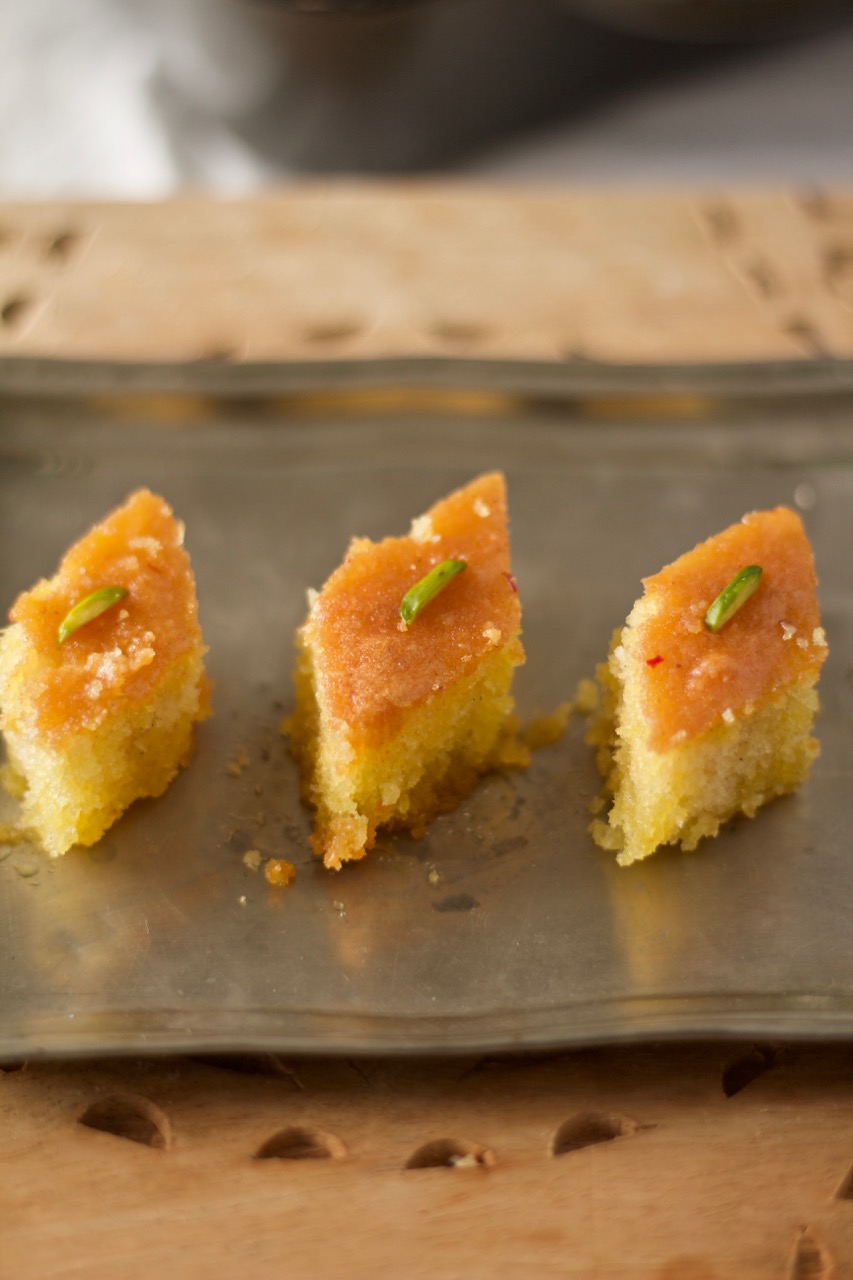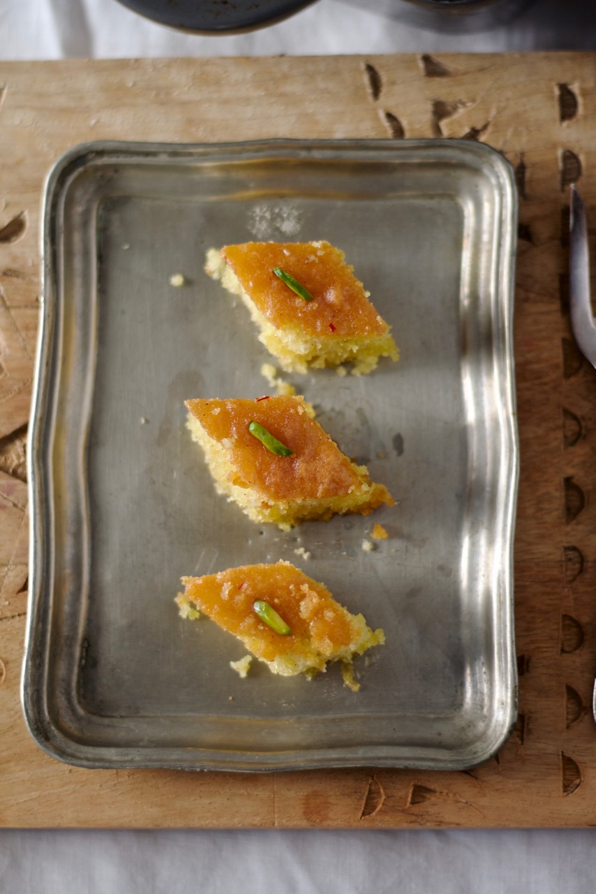 Erst wenn der Kuchen erkaltet ist, den Safran-Sirup zubereiten. Zucker mit Wasser und Safranwasser bei mittlere Hitze für 15 Minuten köcheln lassen. Von der Herdplatte nehmen, Rosenwasser, Honig zufügen und gut verrühren bis der Honig aufgelöst ist. Kuchen erkalten lassen, dann in Rauten oder Würfel schneiden und mit dem noch warmen Safran-Sirup begiessen und 4 Stunden stehen lassen. Jede einzelne Raute mit Pistazienstifte oder gemahlene Pistazien dekoriern.
