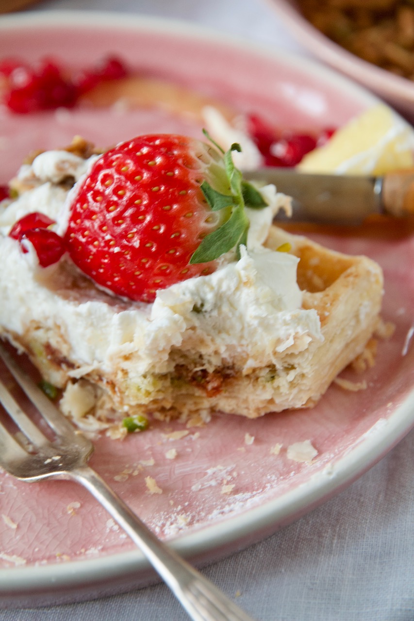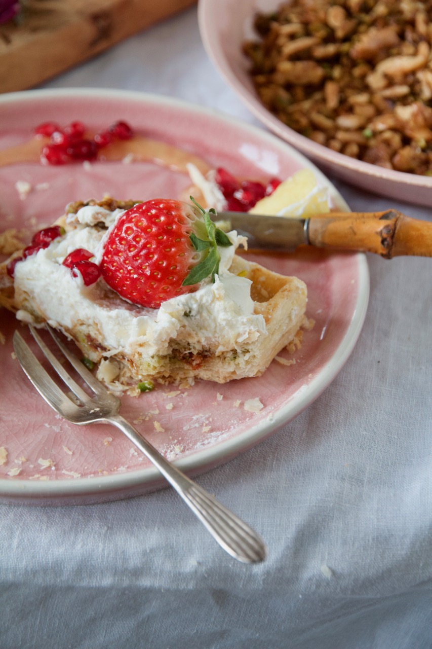 […] persische Pistazien-Rosensahne-Biskuitrolle, Shirini Napoleoni – Napoleonschnitte und die Baklava Waffeln aus 1001 Nacht dazu und du bist im Erdbeer […]