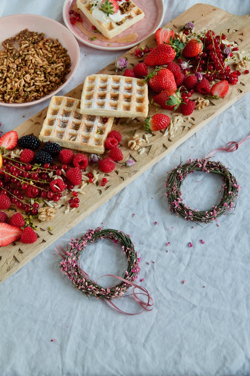 Waffeln mit Rosen-Sahne-Joghurt, kandierte Nüsse, frische Früchte servieren, mit dem Sirup beträufeln und Rosenblütenblätter darüber streuen.
