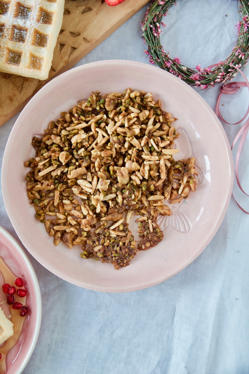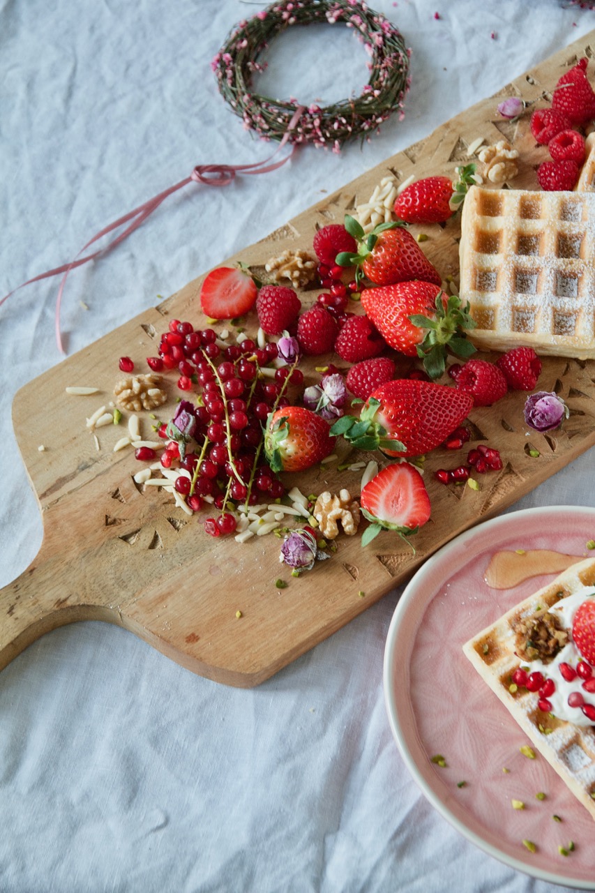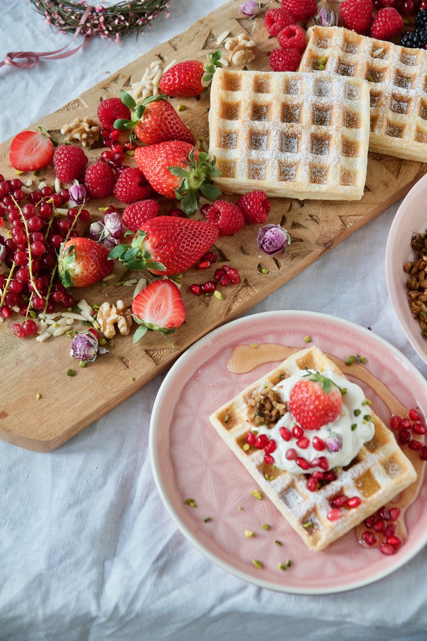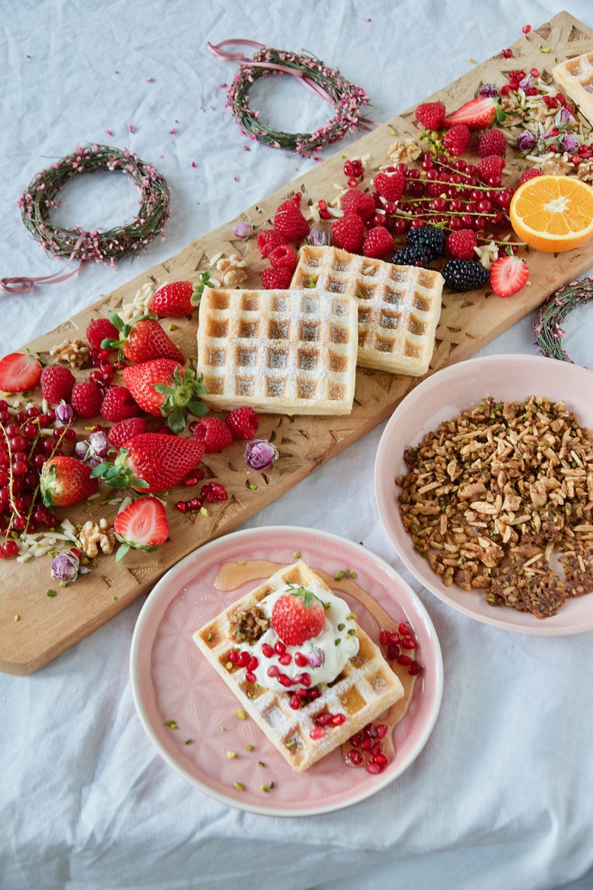 In den tiefen Mulden der Waffeln fließt ein blumiger Rosen-Sahne-Joghurt und ordentlich viel fruchtiger Sirup aus Orangen-, Zitronensaft und Orangenblütenwasser. Dazu reiche ich zimtig kandierte Nüsse aus Pistazien-, Mandelstifte und Walnüsse, getoppt werden sie mit frischen Beeren und Granatapfelkerne. Mehr 1001 Nacht geht wirklich nicht!
