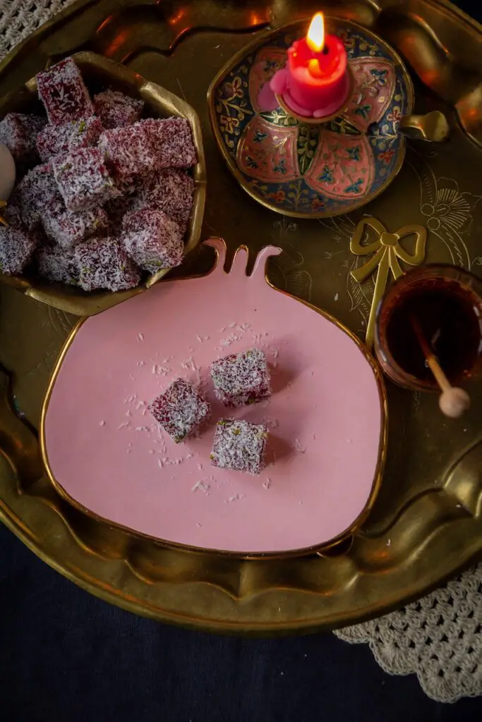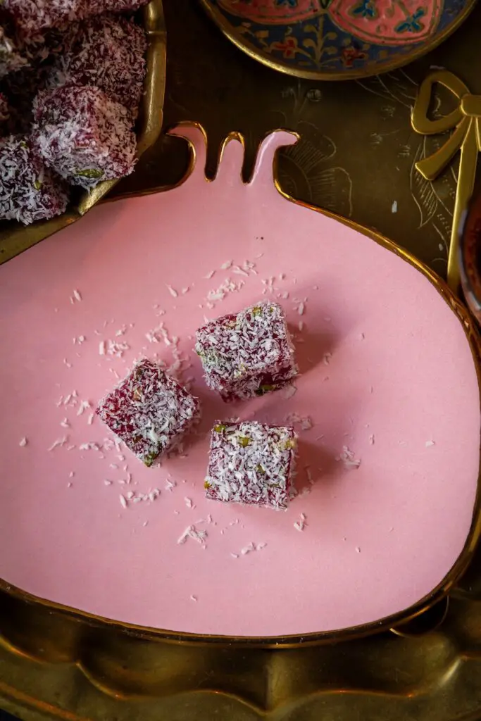 Baslogh Anar – Granatapfel-Pistazien Gelee-Konfekt ähnelt türkischem Lokum – Turkish Delight sehr, beide sind weich, geleeartig und süß. Doch während Lokum meist klassisch gewürfelt daherkommt, wird Baslogh in Persien traditionell rund geformt. Die fruchtigen Sorten wie mein Granatapfel-Baslogh hingegen gibt es ebenfalls als kleine Würfel, sodass sie am Ende fast wie eine persische Schwester des Lokums wirken – vertraut, aber mit einem besonderen Granatapfel-Charme. In der Türkei wird Lokum meist mit Kaffee serviert bei uns in Persien verzaubert der Klassiker Teeabende und Gäste gleichermaßen. Wer also Weihnachten oder Yalda mit einer orientalischen Süße feiern möchte, entdeckt in Baslogh Anar das perfekte Bindeglied.
