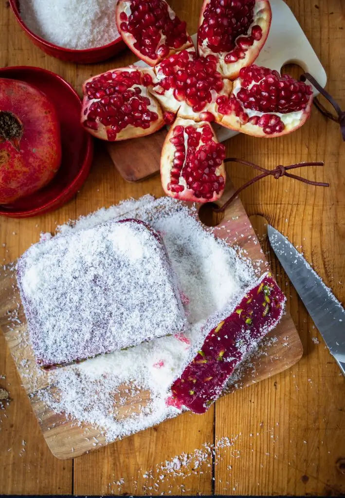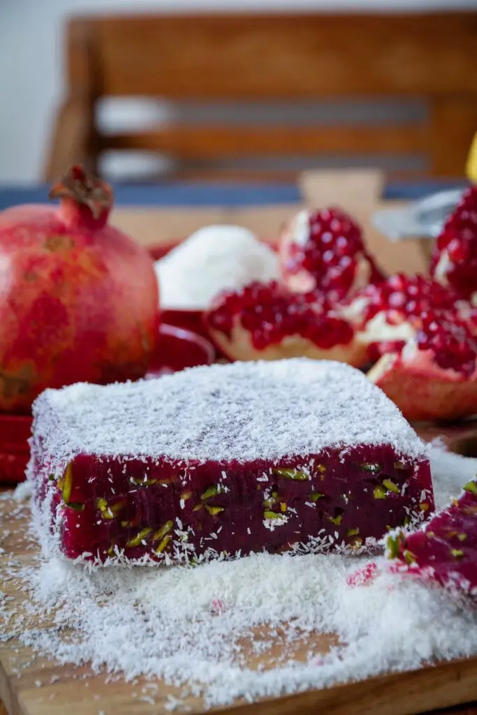An diesem Abend spielt der Granatapfel bei uns die Hauptrolle und hier findest du jede Menge Ideen. Dieses Jahr passt mein Baslogh-e Anar – Granatapfel-Pistazien Gelee-Konfekt einfach perfekt dazu. Weich, geleeartig, fruchtig und leicht säuerlich. Ein bisschen wie türkisches Lokum, aber mit typisch persischer Note und einer Extraportion Granatapfelmagie.