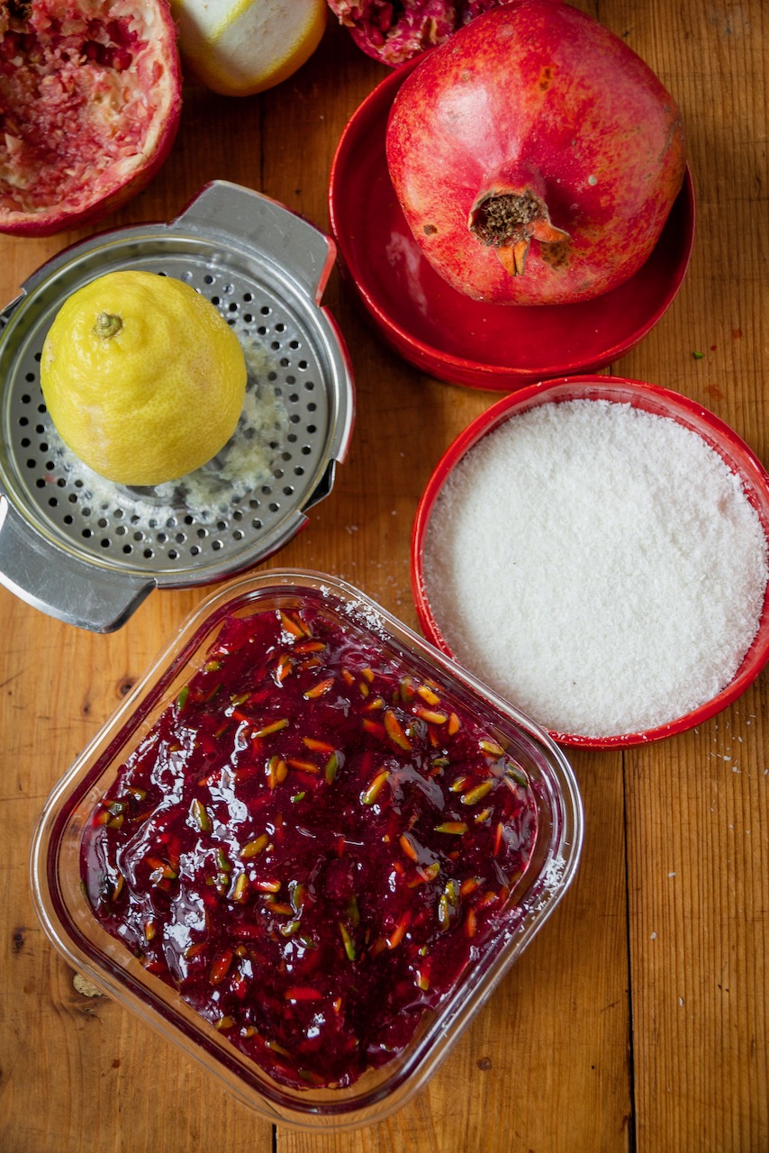 Mais- oder Weizenstärk zusammen mit Granatapfel- und Zitronensaft in einem Topf geben und mit einem Schneebesen mischen. Sobald die Masse fest wird den Zuckersirup nach und nach dazu gießen und weiter köcheln, dabei immer umrühren sonst setzt sie sich am Topfboden ab.