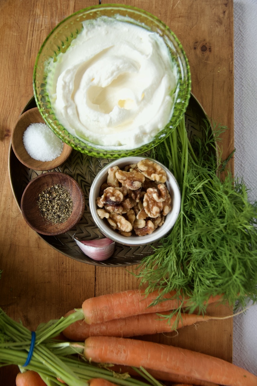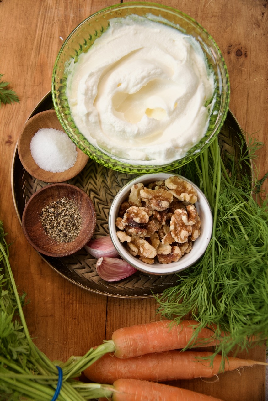 In eine Schale die abgekühlten Karotten hinein raspeln. Dill und Walnüsse fein hacken. Knoblauch pressen und mit Olivenöl zum Joghurt geben. Mit Salz und Pfeffer nach Geschmack würzen. Alles gut vermischen. Für einige Stunden in den Kühlschrank stellen.