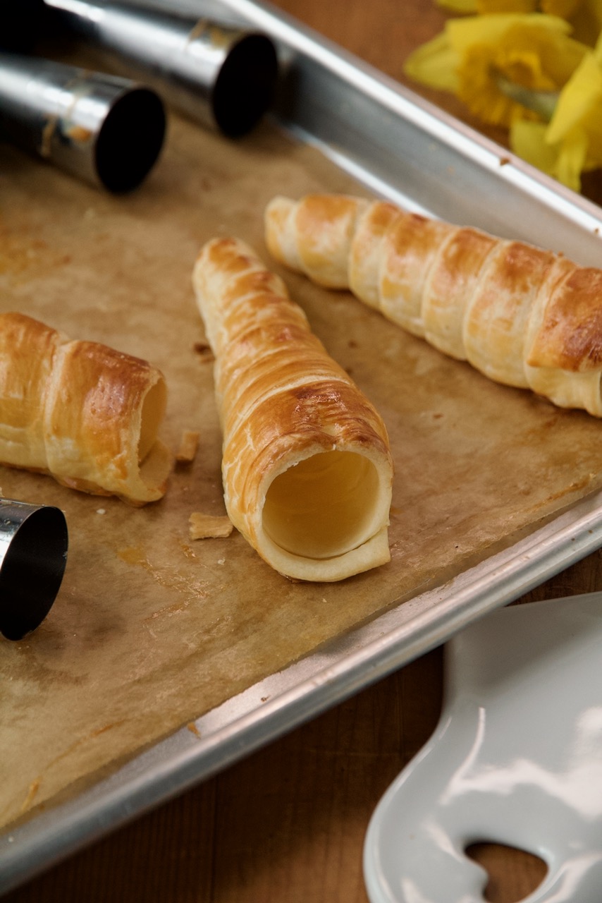 Die Blätterteigstreifen von der Spitze aus überlappend um die Schillerlockenförmchen wickeln und mit etwas Abstand auf ein mit Backpapier belegtes Backblech legen.