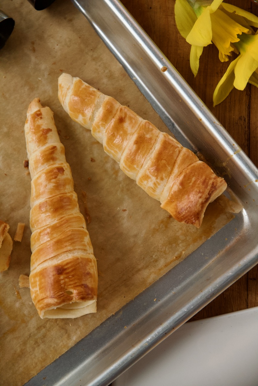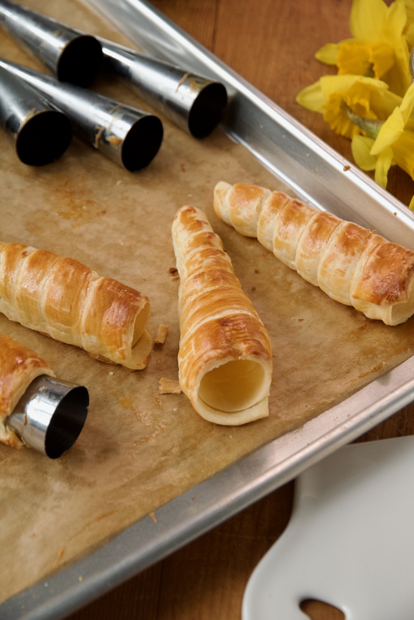 Die noch heißen Blätterteig Karotten vorsichtig von den Schillerlockenförmchen ziehen und vollständig auskühlen lassen.