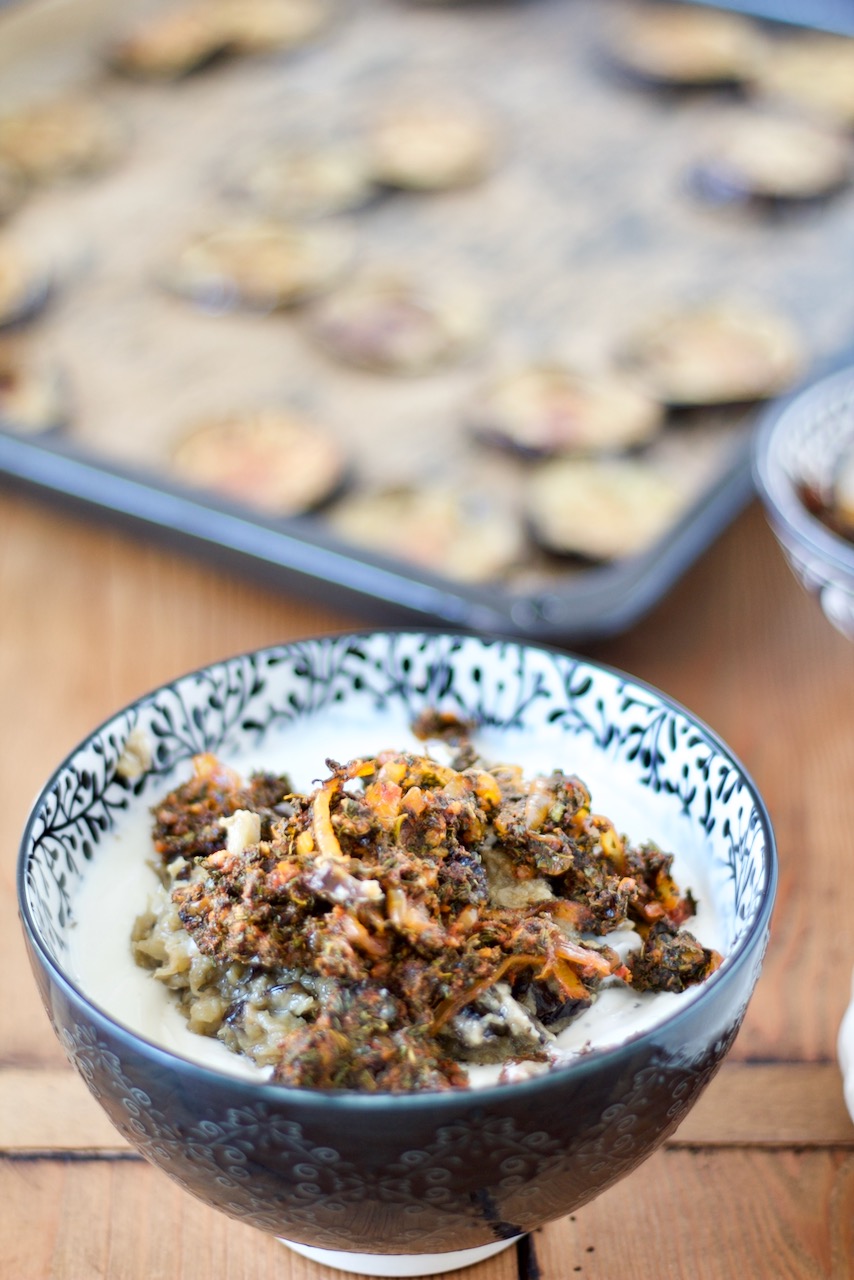 Save some eggplant and a tsp of the tomato-mint mixture for topping later.