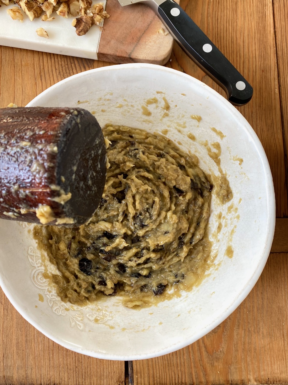 Walnüsse grob hacken, ebenfalls einige für das Topping Beiseite stellen.