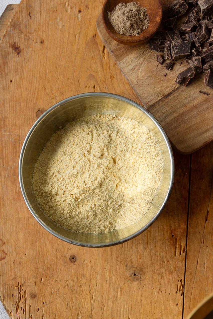 1. In der Zwischenzeit das Kichererbsenmehl toasten. Dafür das Kichererbsenmehl durch ein Sieb in eine Pfanne ohne Öl geben und für 20 Minuten bei geringer Hitze ständig rühren bis der Duft aufsteigt. Das Mehl verliert so Feuchtigkeit und bekommt einen nussigen Geschmack.