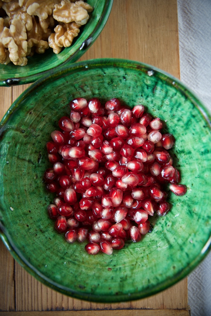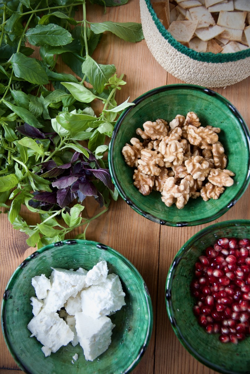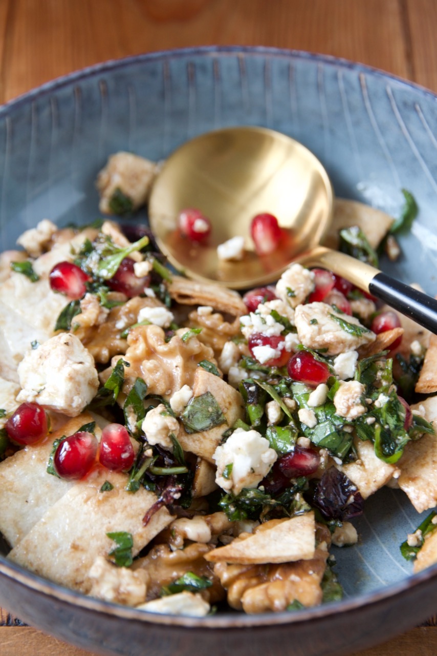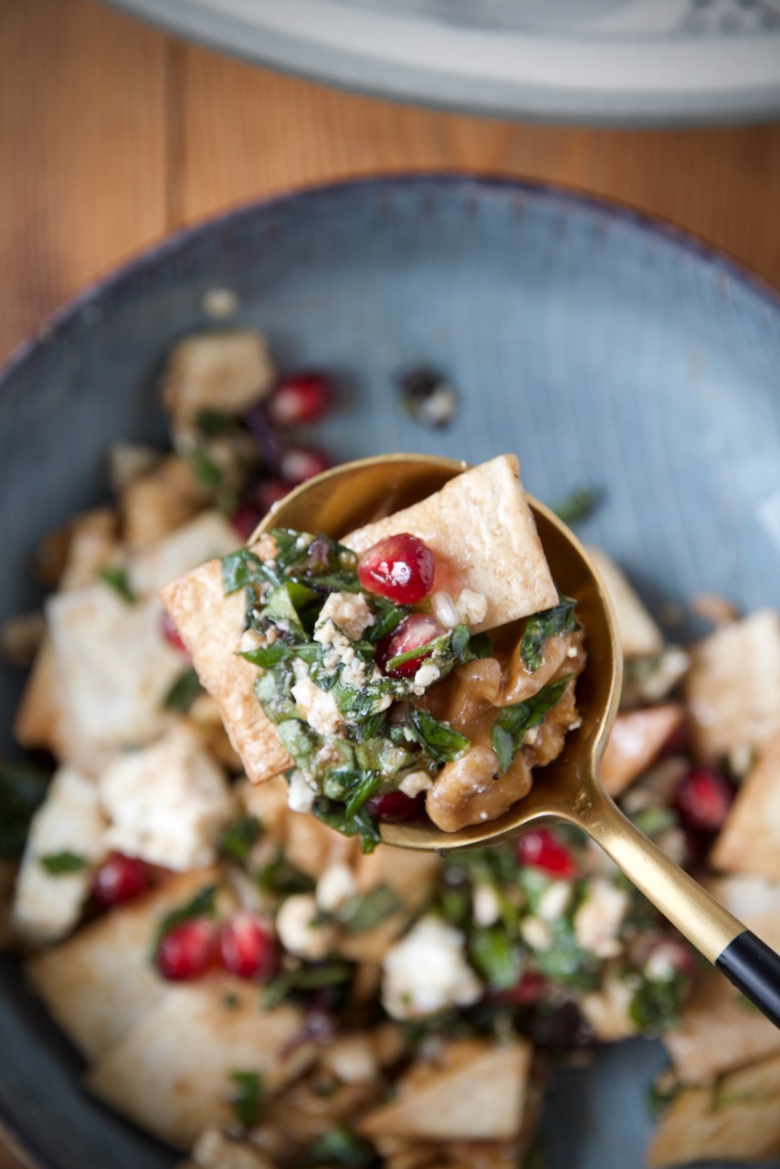 Zum Schluss Granatapfelkerne und das geröstete arabische Brot großzügig über den Salat streuen.
