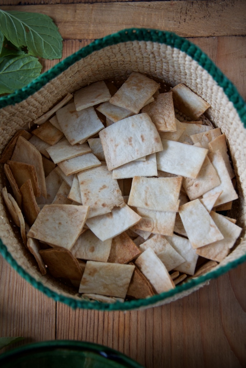 Backofen auf 200 Grad Umluft vorheizen. Ein Blech mit Backpapier auslegen. Die arabischen Brote zunächst in Streifen, dann in große Würfel schneiden. Auf das Backblech legen und für ca. 5 -7 Minuten im Ofen backen, bis sie knusprig sind. Achte darauf, dass sie nicht zu dunkel werden, sonst schmecken sie bitter. Beiseite stellen.