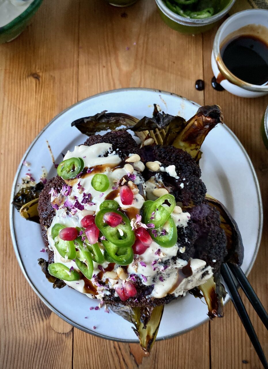 Sobald der Blumenkohl fertig ist aus dem Backofen nehmen, auf einen Teller geben und mit Granatapfelmelasse einreiben und etwas Tahini-Zitronen-Sauce darüber geben. Mit Pinienkerne, Chili, Granatapfelkerne und Rosenblütenblätter garnieren. Einige Tropfen Olivenöl darüber träufeln und mit der restlichen Tahini-Zitronen-Sauce servieren.