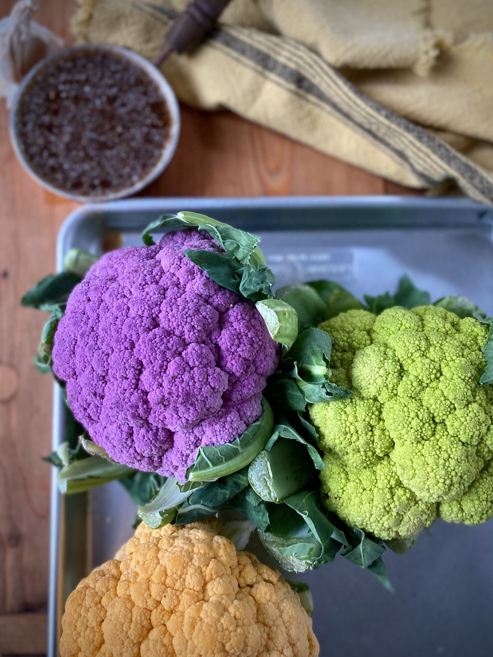 Auf dem Markt habe ich diesen wunderschönen bunten Blumenkohl in Lila, Grün und Orange gekauft, den gibt es nämlich nicht so häufig. Blumenkohl hat in Teb-e Sonati eine traditionelle persische Gesundheitslehre neutrale Eigenschaften. Die Farbe lila erhält der Blumenkohl durch Antocytane-Farbstoffe, diese sind wasserlöslich, die im Zellsaft der Pflanze selbst vorkommen. Da sie wasserlöslich sind, verliert der lila Blumenkohl beim Kochen seine Farbe.