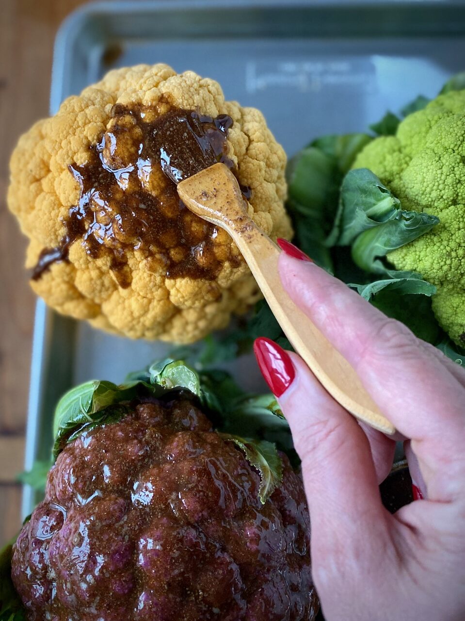 Die Blumenkohle auf ein Backblech legen und mit der Mischung einreiben, in den Backofen schieben und für 45 Minuten rösten bis er dunkelbraun ist. Zwischendurch immer wieder mit dem Fett bestreichen.
