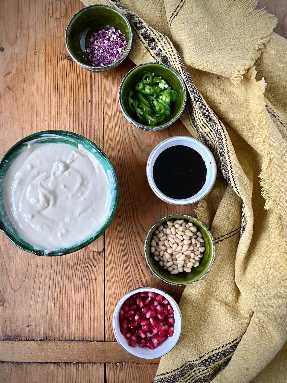 - 2 EL Granatapfelkerne1 1/2 EL Pinienkerne geröstet 1 grüne Chili 1 EL Granatapfelmelasse1 EL Rosenblütenblätter Olivenöl
