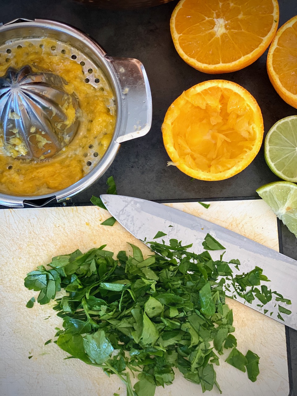 Halve and squeeze the oranges, lemon and lime.