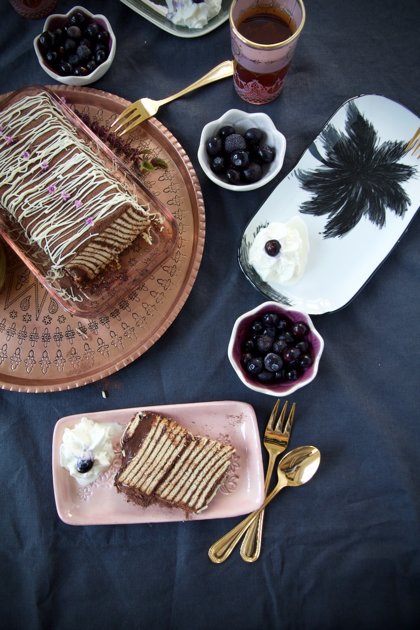 Ein Paar kleinen Unterschiede gibt es schon, denn die persische Version ist nicht so hart und fest (Schokolade), sondern ganz fluffig und weich (Schokocreme). Ausserdem habe ich die Kekse nicht von unten nach oben geschichtet, sondern lege sie vertikal, also aufrecht in die Backform. Wer keine Lust auf exaktes Schichten hat, kann auch einfach die Butterkekse Ruck Zuck zerkleinern und in die Backform füllen. Kinderleicht und Ruck Zuck zubereitet, ist mein Kühlschrankkuchen der perfekte Kuchen für den Nachmittagstee oder einen Geburtstag.