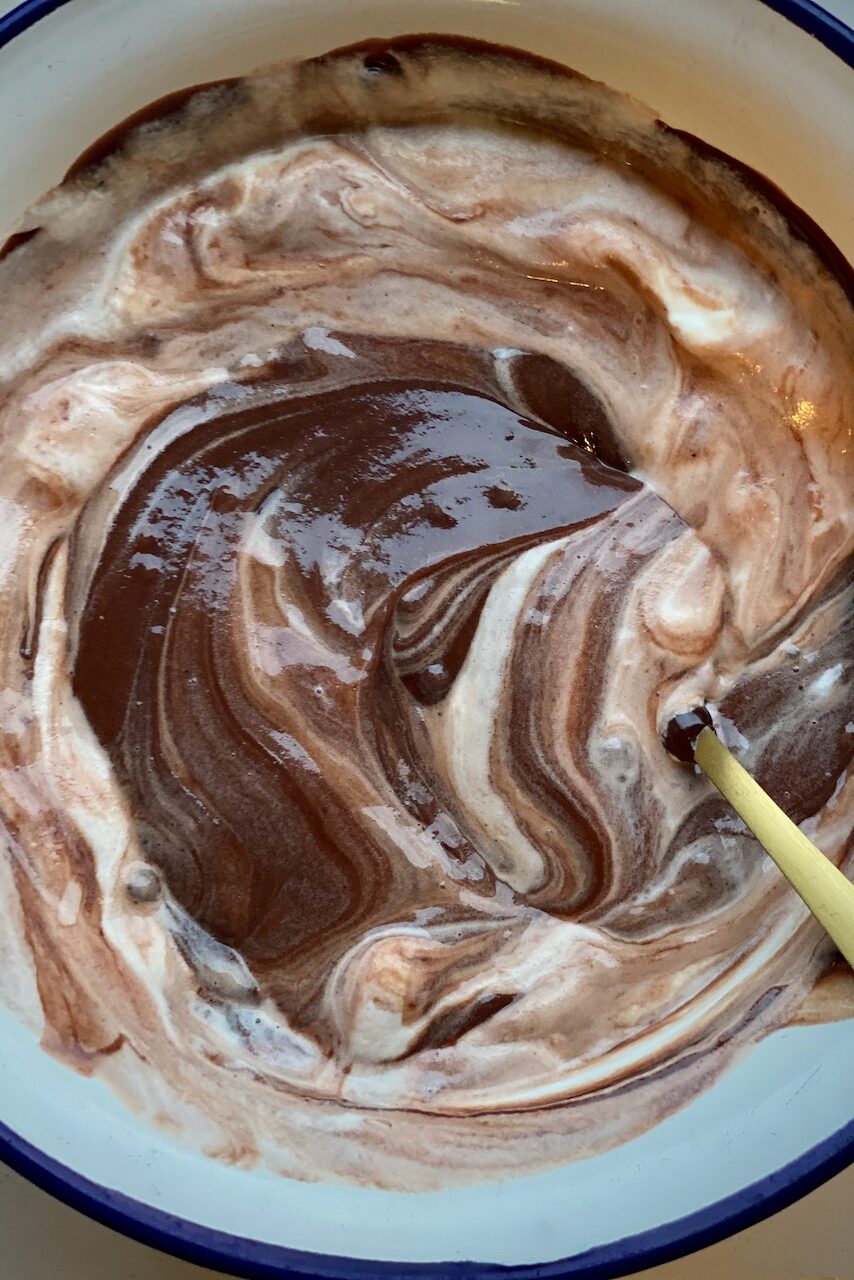11. Über Nacht samt Reste der Schoko Creme in den Kühlschrank stellen.