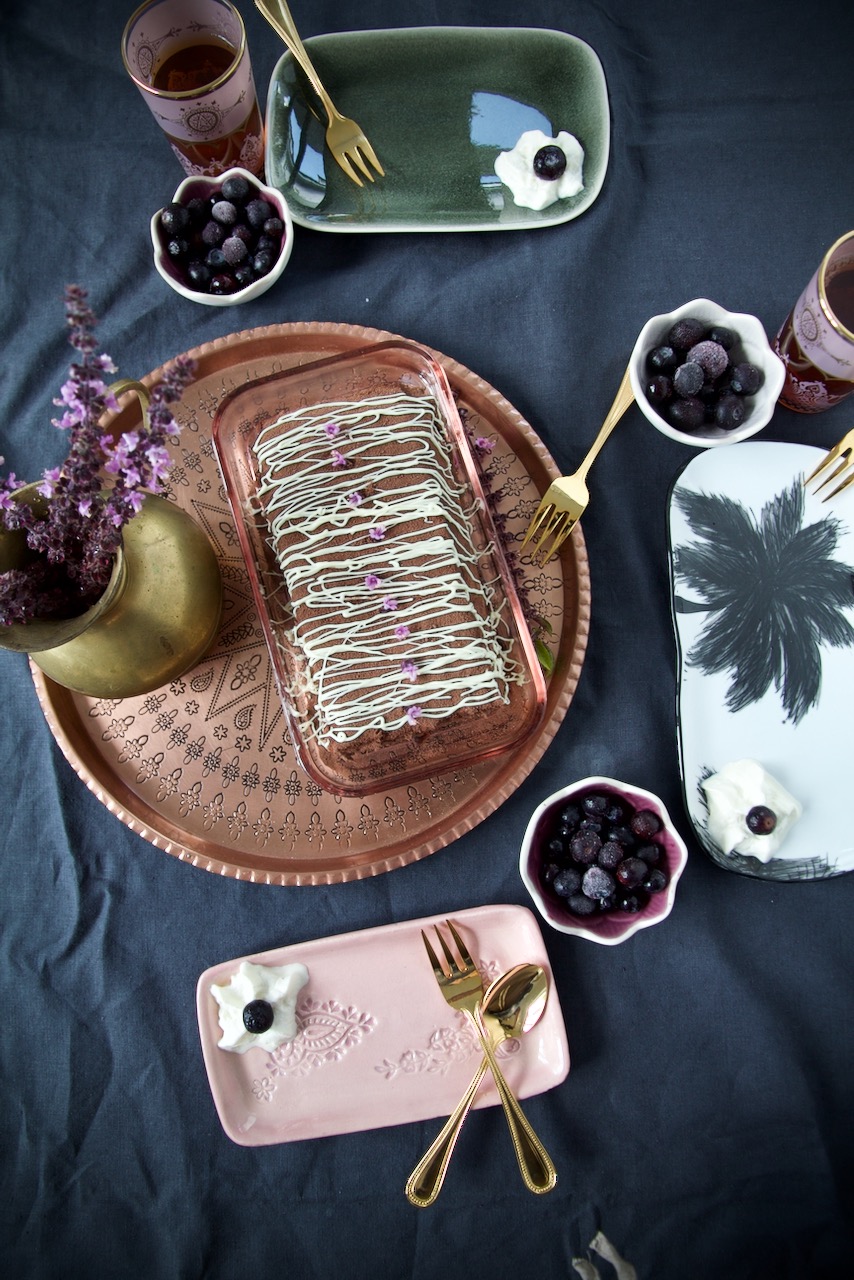 Am nächsten Tag, die Klarsichtfolie entfernen und den Kuchen rundherum mit der restlichen Schoko Creme bestreichen und mit Kakaopulver bestreuen. Die weiße Schokolade in einem Wasserbad schmelzen, in eine Spritztüte mit feiner Tülle geben und den Kuchen damit dekorieren. Ich habe noch einige Basilikumblüten aus dem Garten als Deko darauf gelegt. Nach Belieben mit Schlagsahne und Früchten, wie z. B. Heidelbeeren dekorieren und eine Tasse heißen Tee oder Kaffee dazu servieren.
