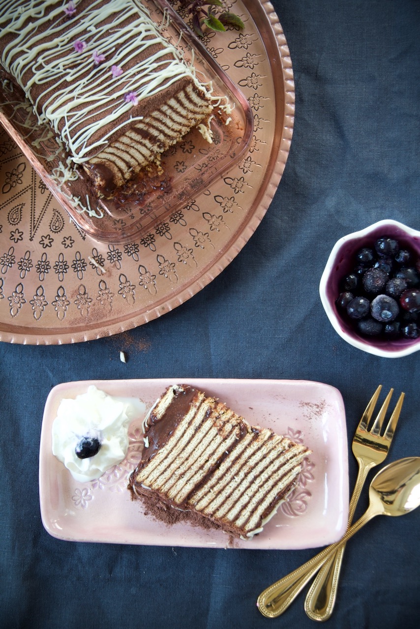 Kalter Kuchen ohne Backen aus weichen Butterkeksen umhüllt mit einer himmlischen Schoko-Creme.