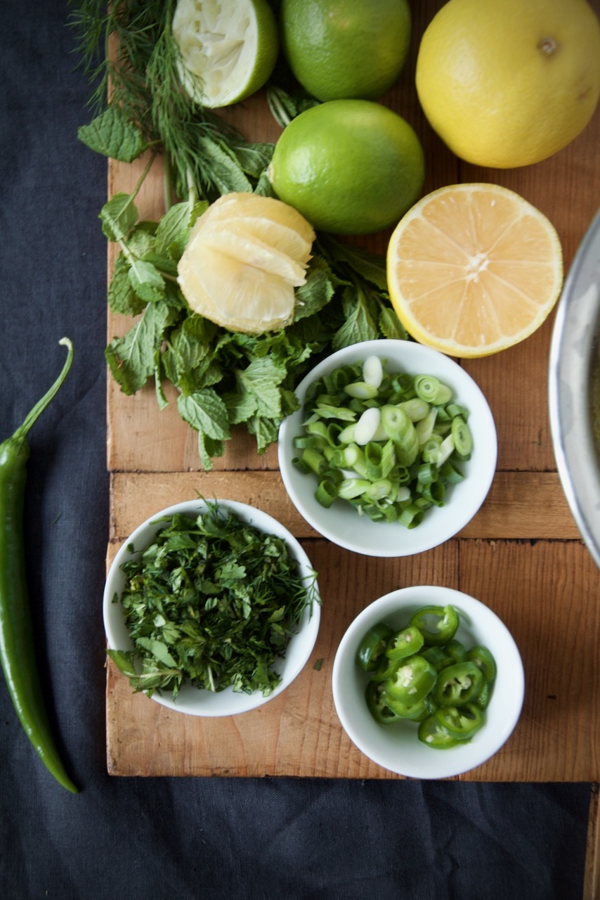 In der Zwischenzeit Granatapfel entkernen und die Kerne beiseite stellen. Frühlingszwiebeln in ganz feine Ringe schneiden. Beiseite stellen. Kräuter waschen, gut abtrocknen, von den Stängel zupfen und fein hacken. Beiseite stellen. Chili in feine Streifen schneiden. Beiseite stellen. Limu Shirin solltest du ganz zum Schluss filetieren, dabei den Saft auffangen und beiseite stellen.