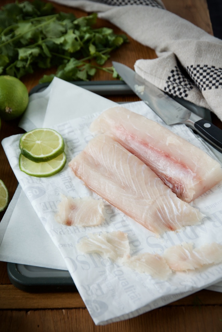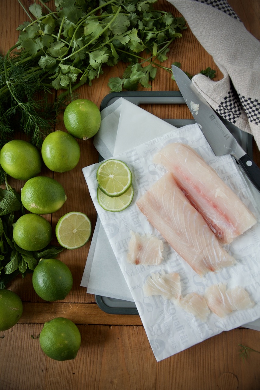 Limetten zunächst auf der Arbeitsfläche mit der flachen Hand rollen, dann auspressen und über die Filets geben und für 5 – 10 Minuten in den Kühlschrank stellen.