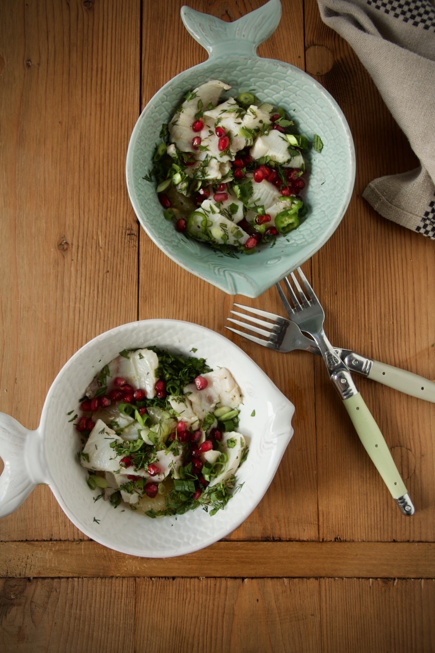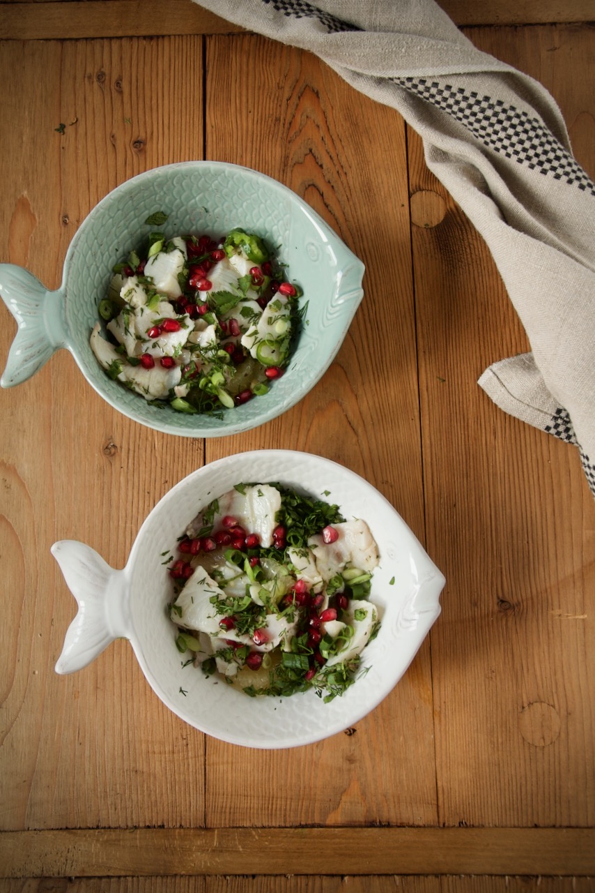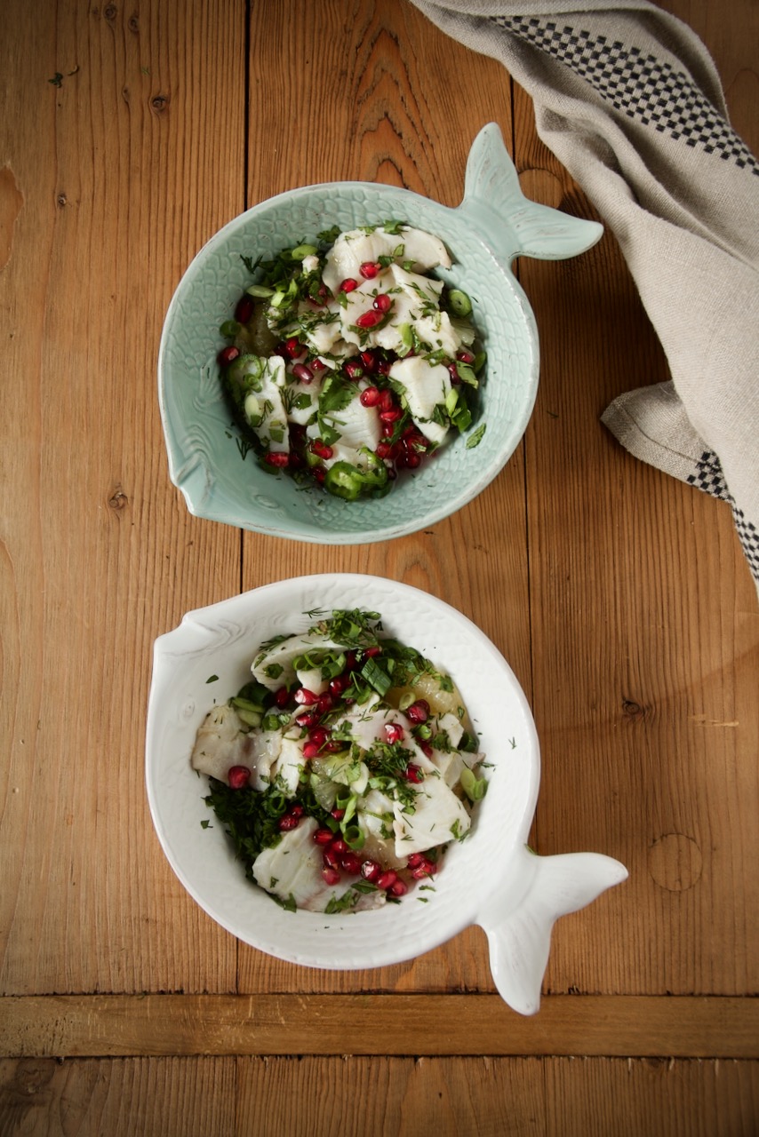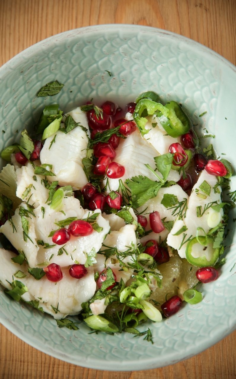 Heute möchte ich dich mit meinem einzigartigen Rezept aus meiner Fusionsküche verwöhnen. Ich kombiniere den peruanischen Klassiker Ceviche mit persischen Einflüssen zu einem einzigartigen Geschmackserlebnis – Ceviche vom Cobia mit Limu Shirin, Kräuter und Granatapfelkerne. Cobialoins werden mit Granatapfelkerne, Filets vom Limu Shirin und Olivenöl garniert und bekommen einen orientalischen Touch. Kräuter wie Koriander, Dill, Minze heben den Geschmack des Fisches hervor und Chili sorgt für eine leichte Schärfe. Die Tigermilch ist aus Limettensaft und rundet das Ganze ab, kurz vor dem servieren füge ich noch etwas Saft von Limu Shirin zu. Das Rezept ist ganz frisch, einfach, kalorienarm und ist schnell zubereitet. Es eignet sich auch perfekt als Vorspeise für ein unkompliziertes weihnachtliches Festmahl oder für dein Sylvestermenü.