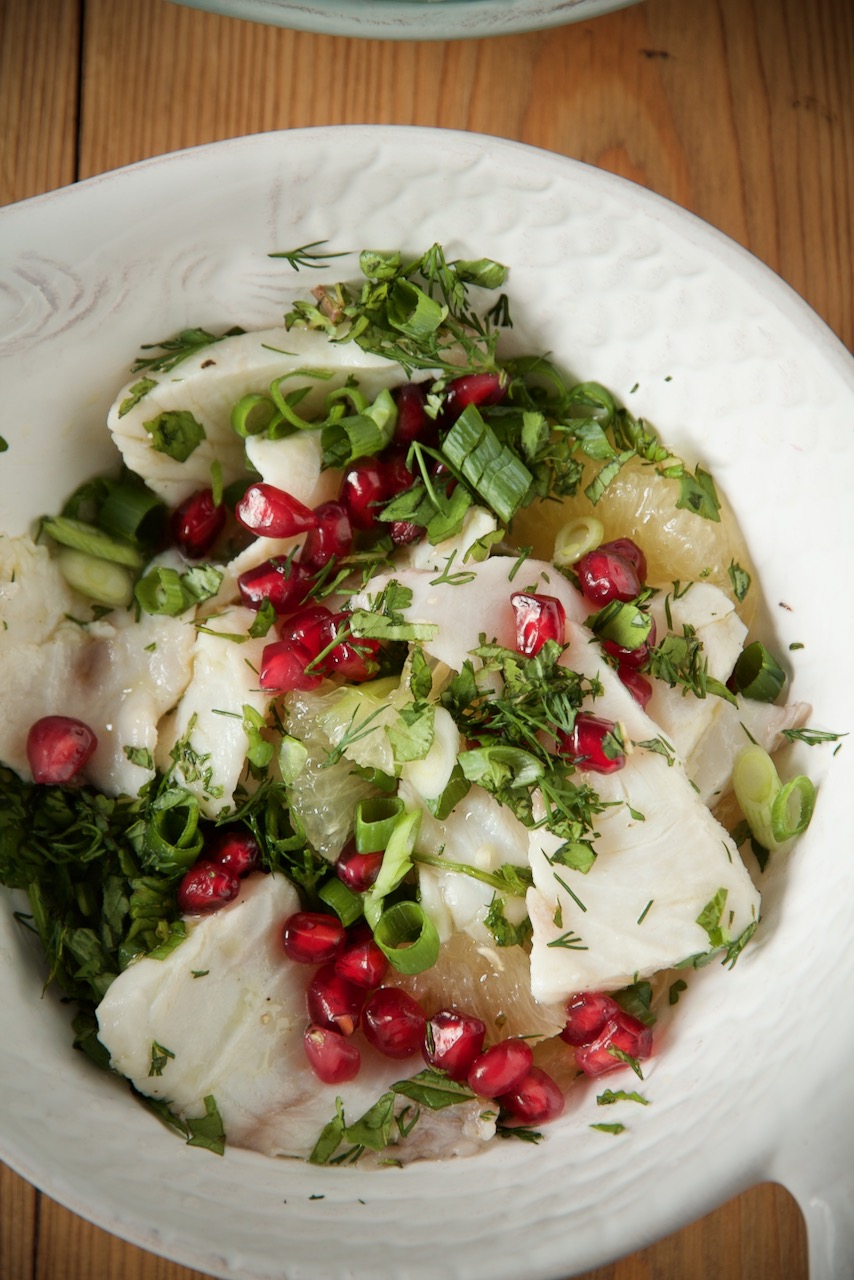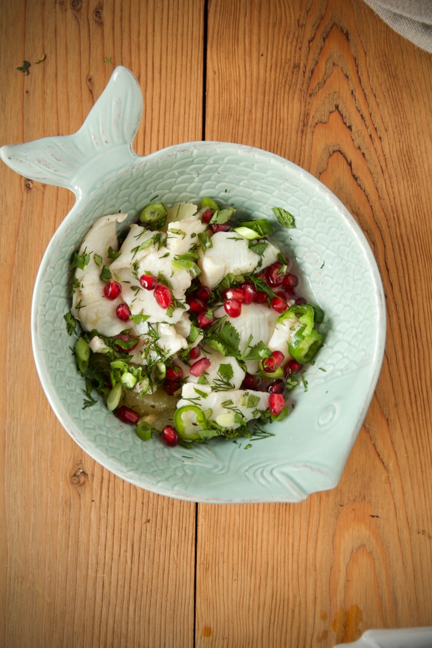 Cobia Ceviche with limu shirin, herbs and pomegranate seeds