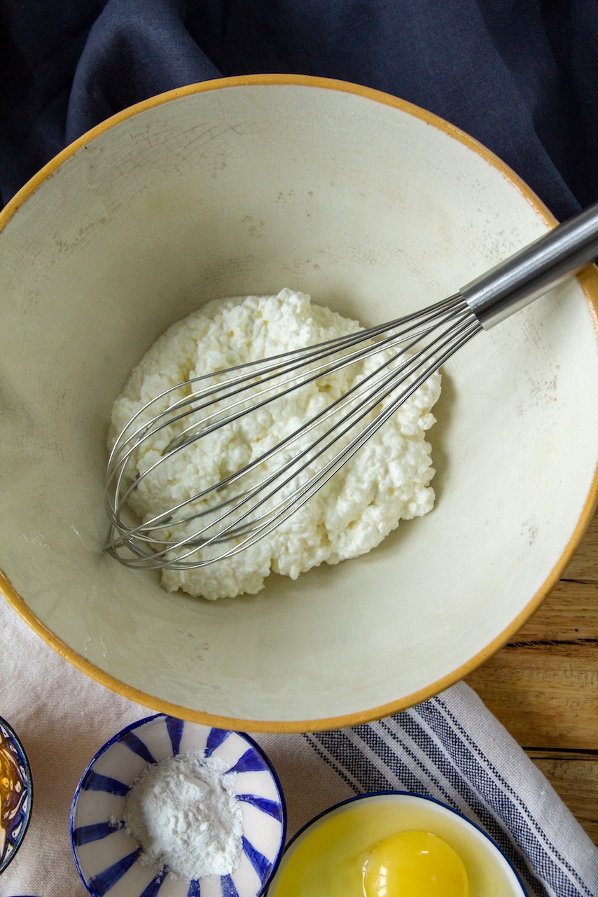 Hüttenkäse und Eier in einer großen Schüssel mit einem Schneebesen oder mit einem Zauberstab mixen bis die Masse glatt ist.