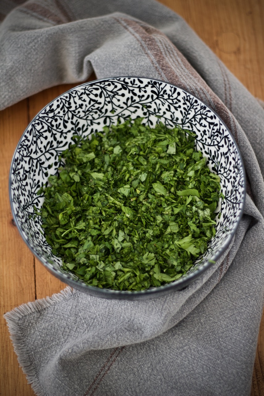 In der Zwischenzeit die Kräuter waschen, gut abtrocknen und fein hacken.