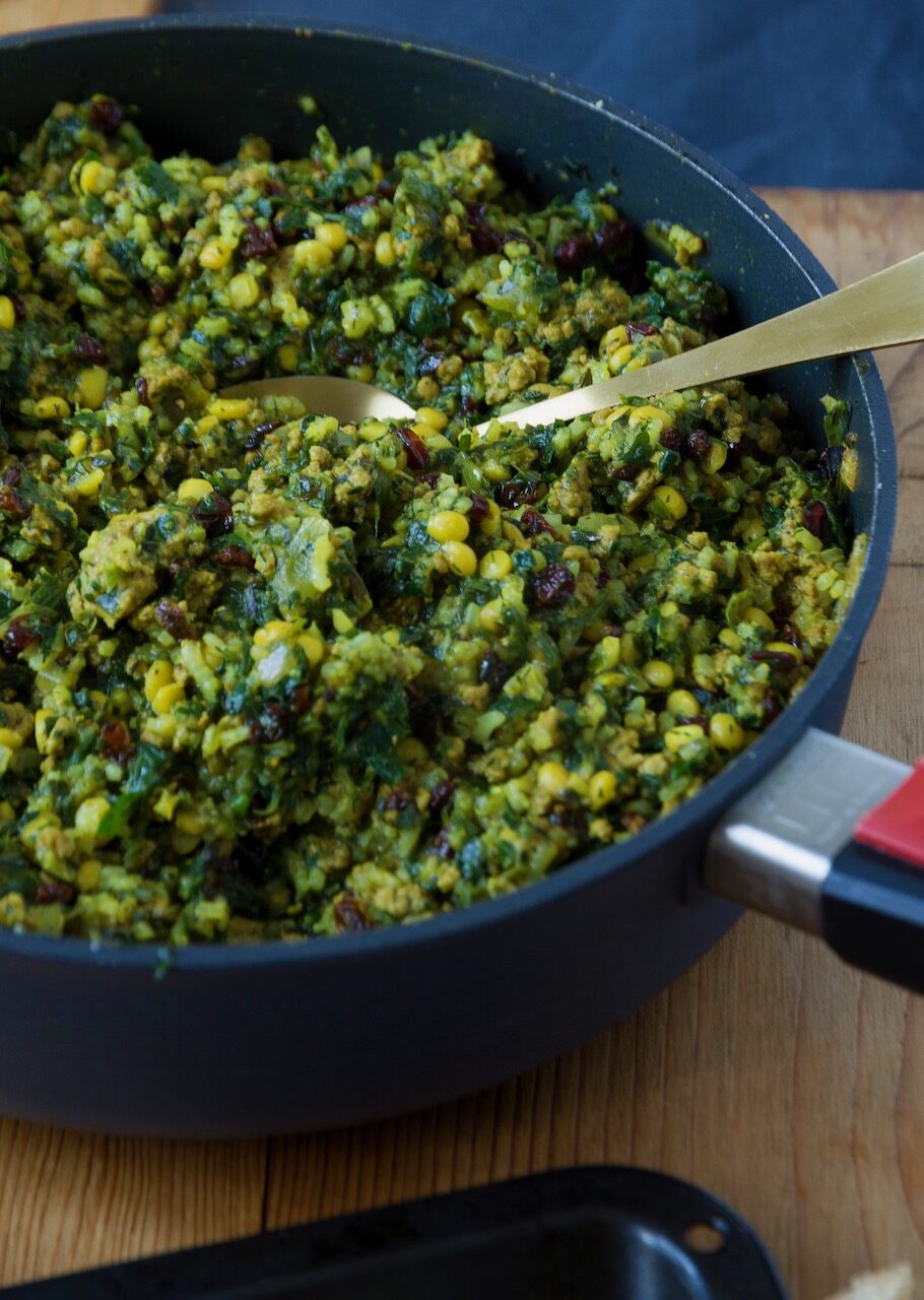 Kräuter waschen, gut abtrocknen und fein hacken. In etwas Öl anbraten, Berberitzen und Safranessenz zufügen und für 5 Minuten mit braten. Alle bisherigen Zutaten zufügen und gut mischen.