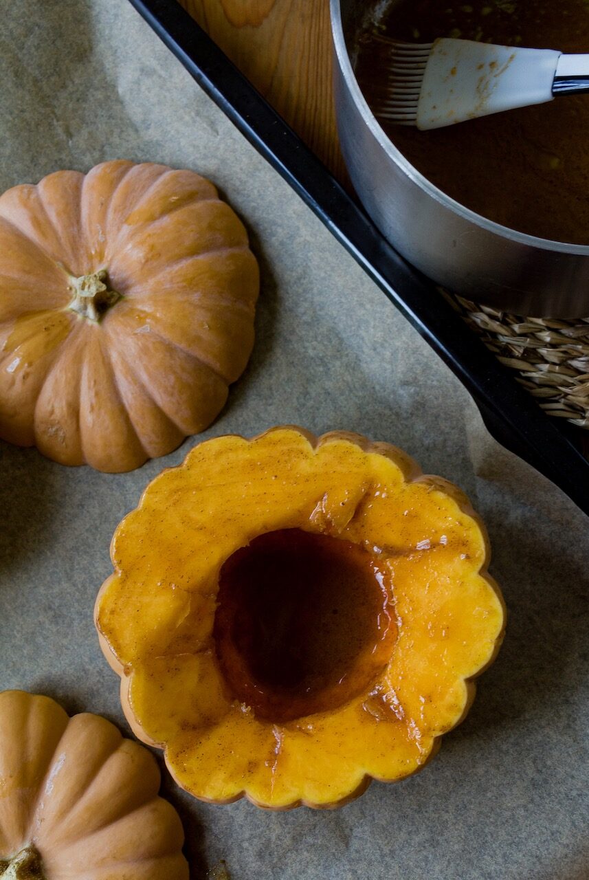5. Butter zum schmelzen bringen, mit Zimt, Ingwer und Zitronensaft mischen und die Kürbisse von Innen damit einreiben.
