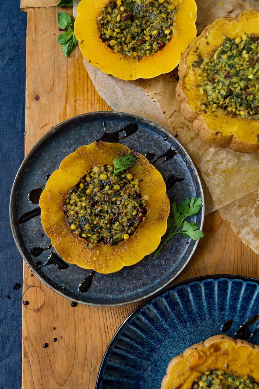 Kürbis schmeckt im Herbst und Winter einfach immer, besonders wenn er gefüllt und aus dem Ofen kommt. Probier doch Kürbis einmal anders, nämlich in einer persischen Version. So gibt es heute Dolmeh Kadu Halvai – gefüllter Kürbis دلمه کدو حلوایی mit schmackhaften orientalischen Zutaten. Der Muskatkürbis wird mit einer Mischung aus herzhaftem Lammhackfleisch, aromatischem Reis, knackigen gelben Spalterbsen, köstlichem Safran, frischen Kräutern und orientalischen Gewürzen gefüllt. Für ein fruchtiges Extra wird der gefüllte Kürbis mit süß-saurem Granatapfelsirup getoppt. Solange im Backofen backen bis der Muskat-Kürbis weich und zart ist und die Aromen in der Füllung sich verbinden. Ein herzhaftes und köstliches Rezept, das sich perfekt für Shabe Yalda oder dein Weihnachtsessen eignet. Comfort Food at its Best!