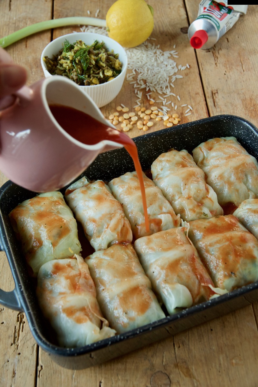 In einer Auflaufform die gefüllten Kohlrouladen geben und mit der zitronigen Tomatensoße begießen.