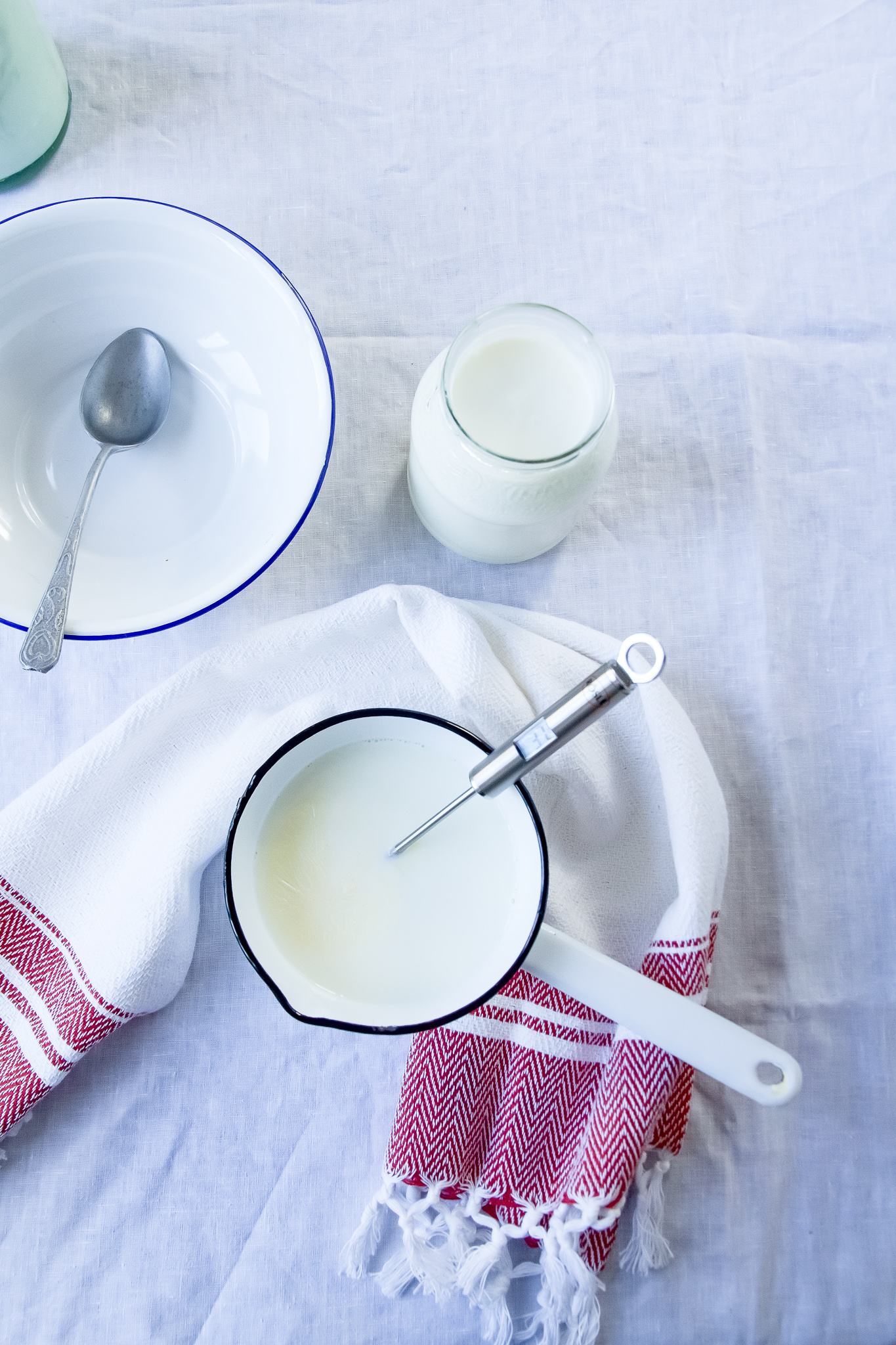 Da ich den Backofen ja 12 Stunden hab laufen lassen, habe ich noch Schafsjoghurt aus Schafsmilch und Ziegenjoghurt aus Ziegenmilch gemacht. Die Bettdeckenmethode hat meine Mama immer gemacht und funktioniert auch ganz einfach.