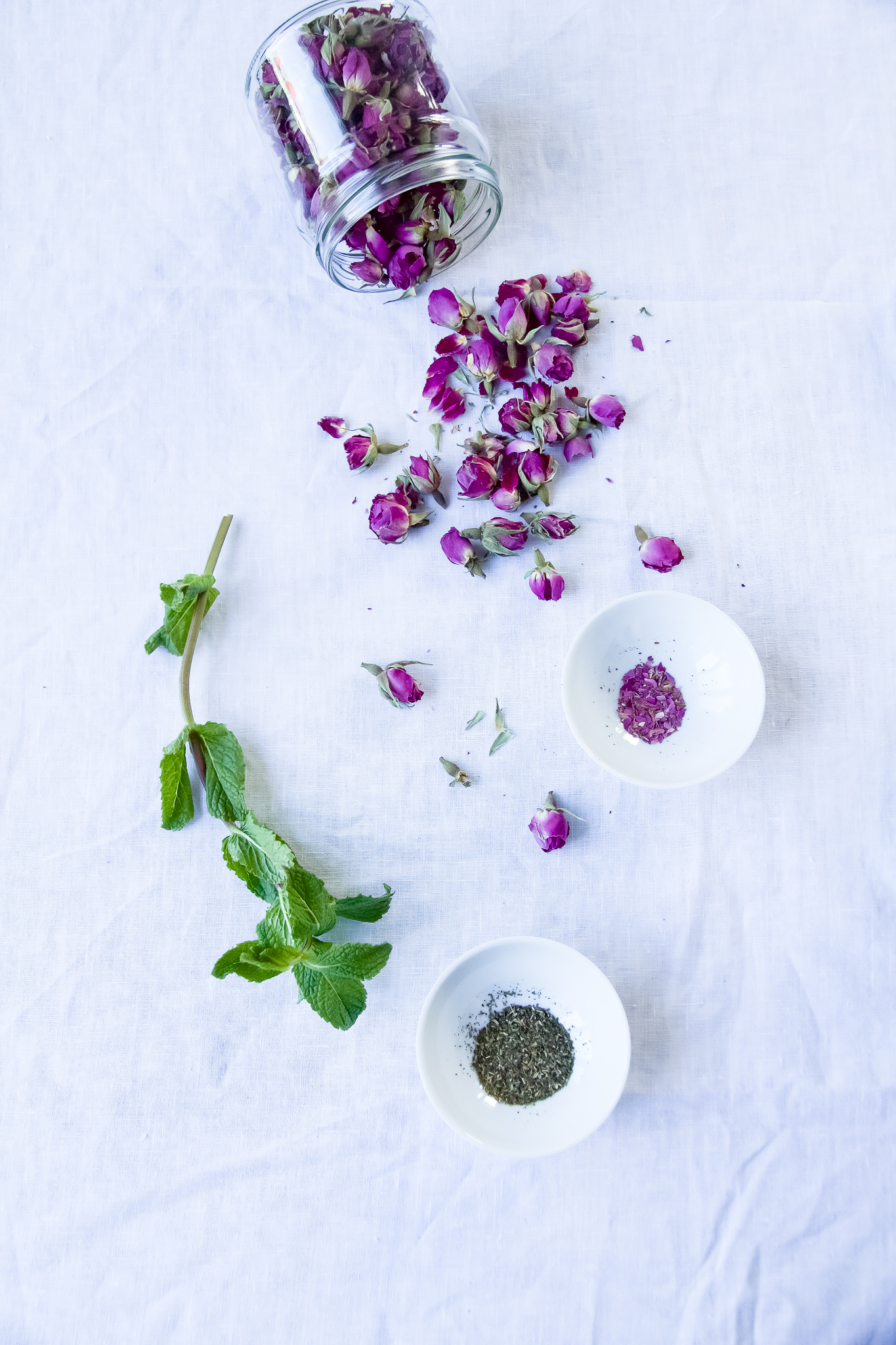 Getrocknete Minze und Rosenblütenblätter zufügen und noch einmal rühren