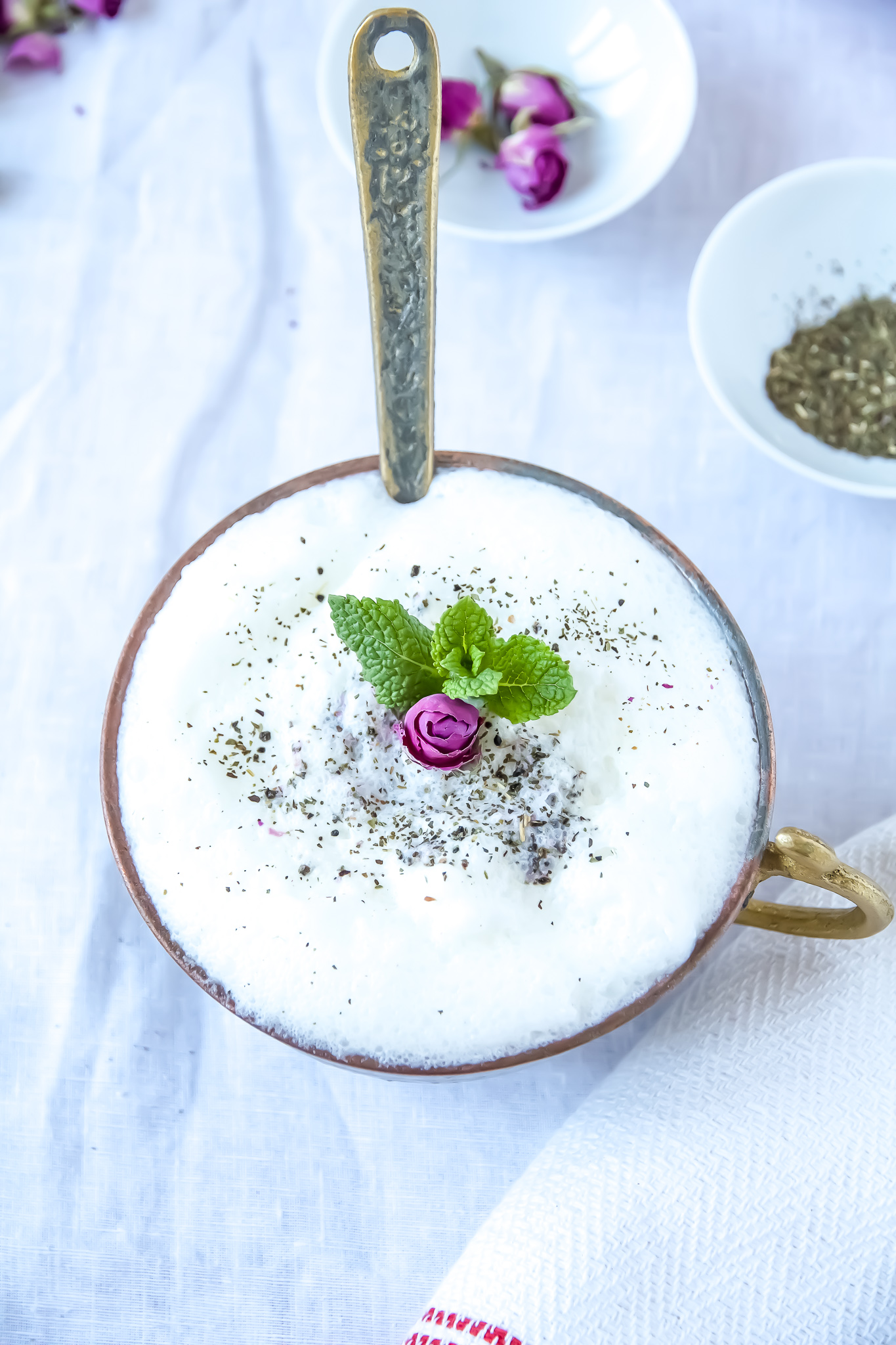 Joghurt nach Geschmack salzen und pfeffern, in eine Kanne geben und mit Wasser aufgiessen. Mit einem Stabmixer oder mit einem Schneebesen den Joghurt aufschlagen bis er leicht schäumt. Getrocknete Minze und Rosenblütenblätter zufügen und noch einmal rühren. Verwende auf jeden Fall getrocknete Minze, denn diese ist viel Geschmacksintensiver als frische Minze. Die frische Minze ist später als Dekoration gedacht und gibt noch ein wenig Aroma an Dugh ab. Bis zum Servieren gut kühlen.