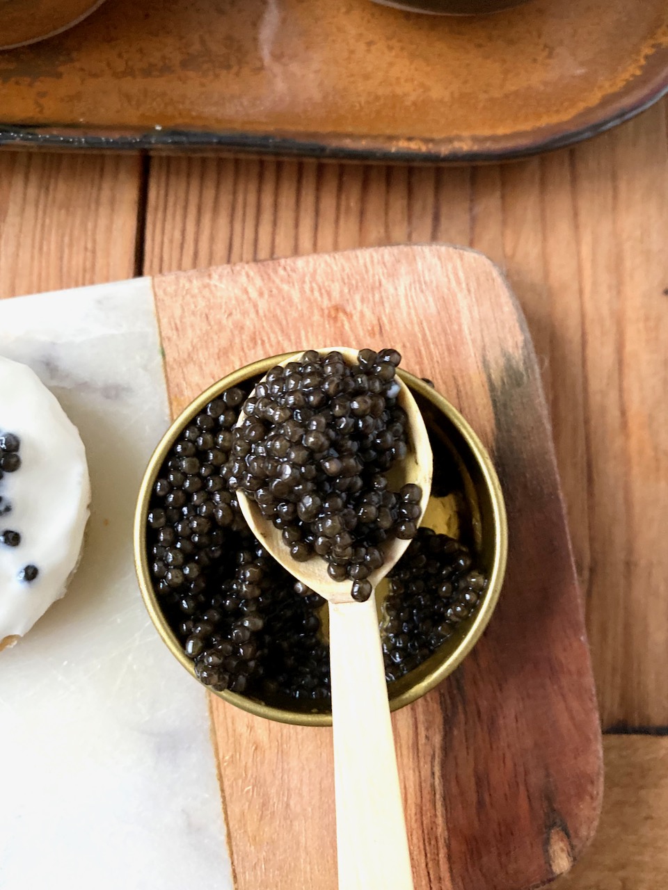 Zurück zum Kaviar! Nimm ca. 15 – 30 Minuten vor dem Verzehr den Kaviar aus dem Kühlschrank und öffne aber die Dose erst ganz kurz vor dem Verzehr. Am Besten rechnest du mindestens 10 bis 15 Gramm pro Person. Um richtig in den Genuss zu kommen sogar 50 – 100g pro Person. Natürlich gibt es nach oben hin keine Grenze, ich sag nur große Dosen. Verwende keinen Löffel aus Metall, denn der Kaviar kann dann oxidieren und sein toller Geschmack wird dann verfälscht und metallisch. Meist wird ein Löffel aus Perlmutt oder Holz verwendet. Guter Kaviar hat einen jodig-salzig-cremigen Geschmack, mit einem gewissen Biss und einer Schmelzigkeit.