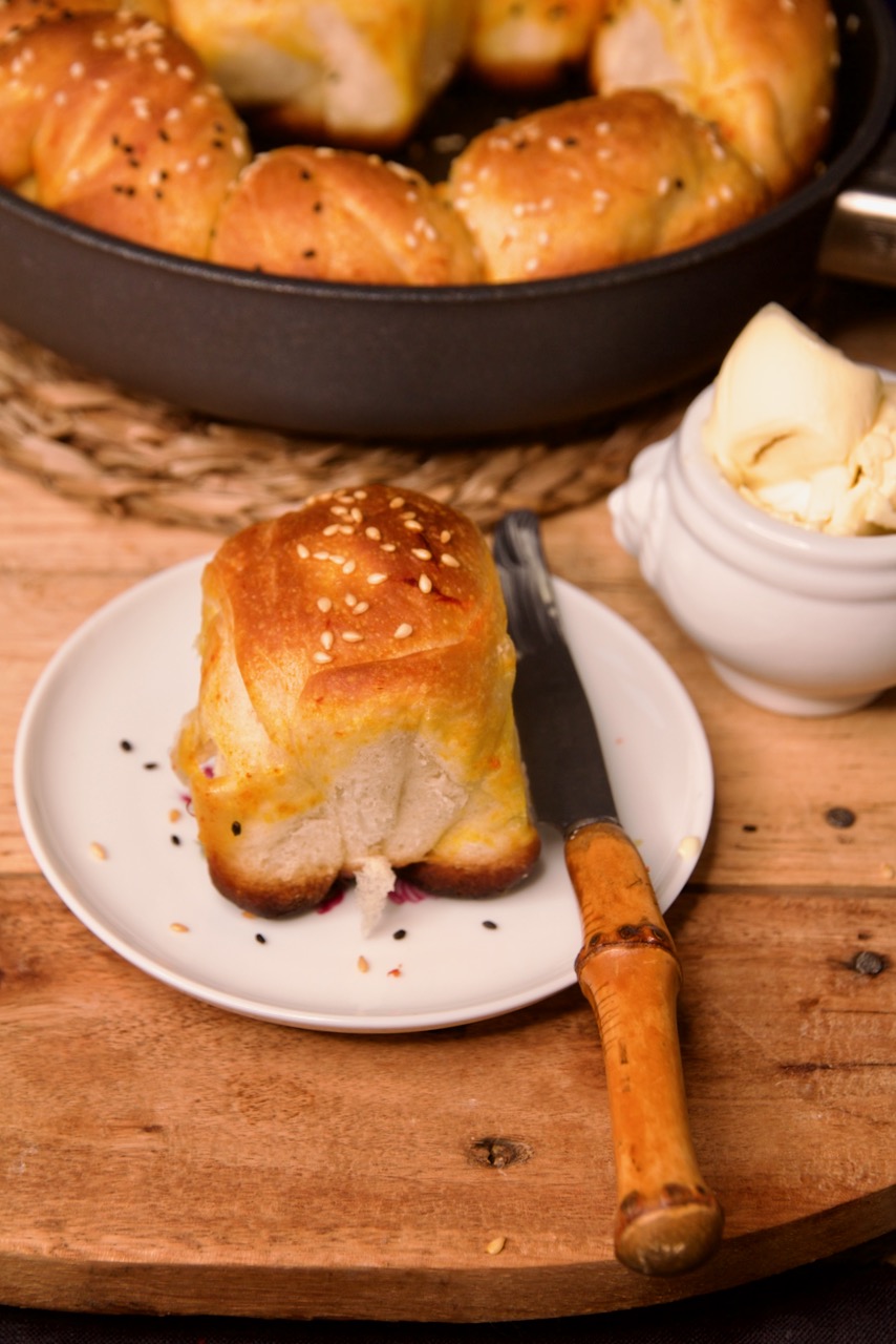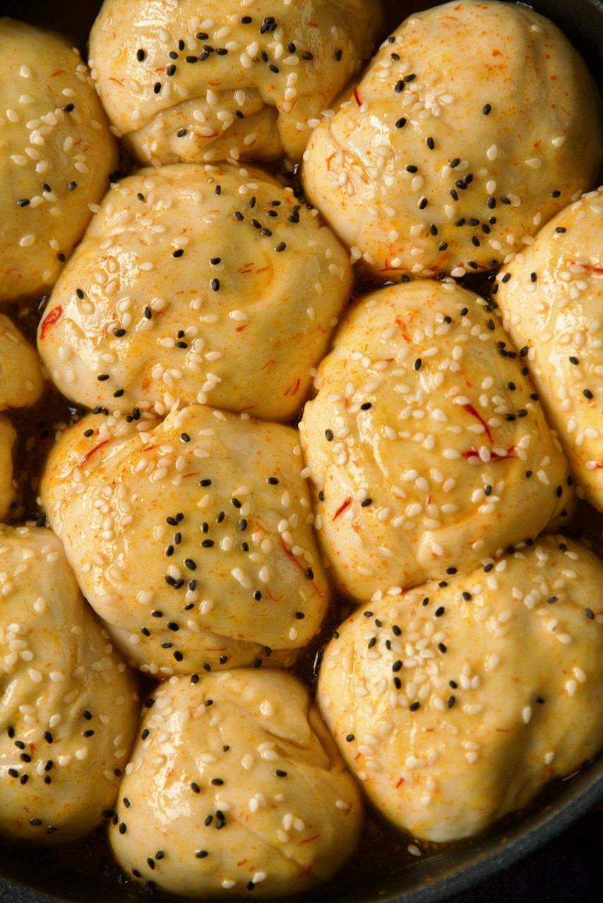 Safranfäden in einem Mörser fein mahlen und zur geschmolzenen Butter geben, alles gut verrühren. Das Roomal mit einem Pinsel* auf die Brötchen einstreichen. Mit Sesam und Schwarzkümmel bestreuen. Den Deckel auf die Pfanne geben und für ca. 15 – 20 Minuten bei mittlere Temperatur backen. Die letzten 5 Minuten den Deckel abheben. Wenn du sie oben etwas krosser haben willst, kannst du sie bei 200° für 5 – 8 min. golden backen.