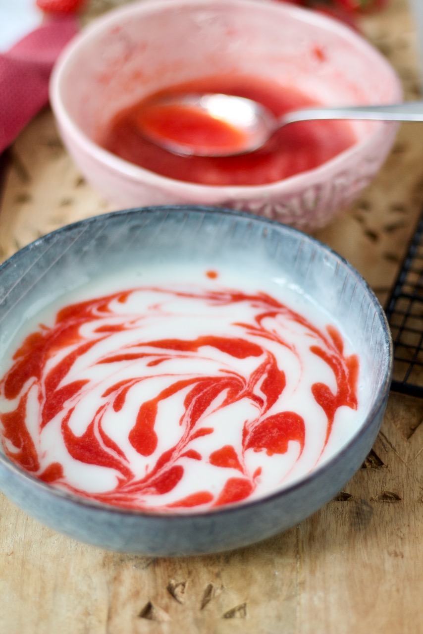 Die Hälfte vom Erdbeerpüree in die Labneh Glasur träufeln und mit einem Schaschlik Spieß Muster einrühren.