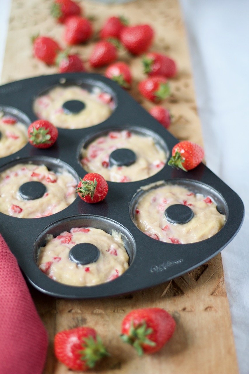 Erdbeer Donuts in einer "leichten" Version, sie werden mit saftigen Erdbeeren gefüllt und anschließend mit weiteren köstlichen Erdbeeren belegt.