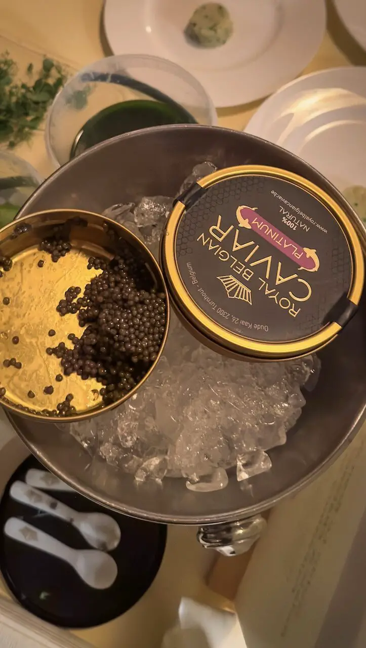 Ein belgisches Soulfood-Erlebnis auf Sterneniveau präsentierte uns Arne Beirinckx* vom Restaurant Aurum im Kasteel van Ordingen in Sint-Truiden: Seine Interpretation der Miesmuschel war ein echtes Spektakel! Stell dir eine perfekte Kombination aus rauchigem, gegrilltem Lauch, salzigen Meereskräutern und dem Knusper-Effekt von Muschelkrackern und Kartoffeln vor, alles wunderbar umschmeichelt von einer samtigen Buttermilch-Algen-Sauce mit feinem Forellen-Rogen.